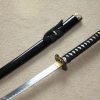 - Carbon steel blade, 68cm long, 3.0cm wide, 4.0mm thick, shiny brush hamon edge, wavy habuchi pattern featuring differential tempering treatment, black nylon braided handle, 29cm long with golden bamboo guard and pommel cap;